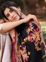 This black shawl/dupatta is crafted in organic khadi cotton fabric. It is Heavily aari Embroidered with different kashmiri motif. It is fenced with wine dyed cotton tassel lace and fringe lace on both the ends. For winters it is perfect as a fancy shawl and for festive it is perfect to carry on your fancy outifit.